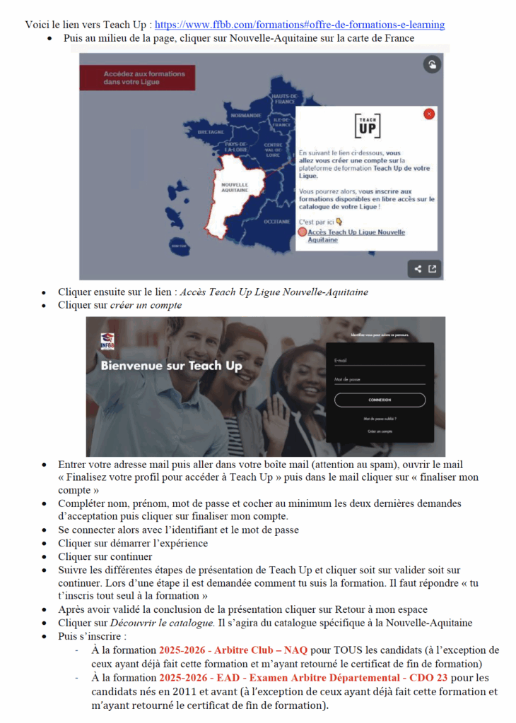 Elearning Arbitre Club Elearning Arbite Départemental Nés en 2012 (formation sur 2 ans) Nés en 2011 et avant (formation sur 1 an) | Dimanche 14/12 à Aubusson 09h00 – 17h00 | Dimanche 11/01 (lieu à déterminer) 09h00 – 17h00 | Dimanche 22/03 à Bonnat 09h00 – 17h00 | Dimanche 19/04 à Auzances 09h00 – 17h00 | 1 épreuve écrite et 1 épreuve orale à valider 1 épreuve pratique (observation match à valider) |